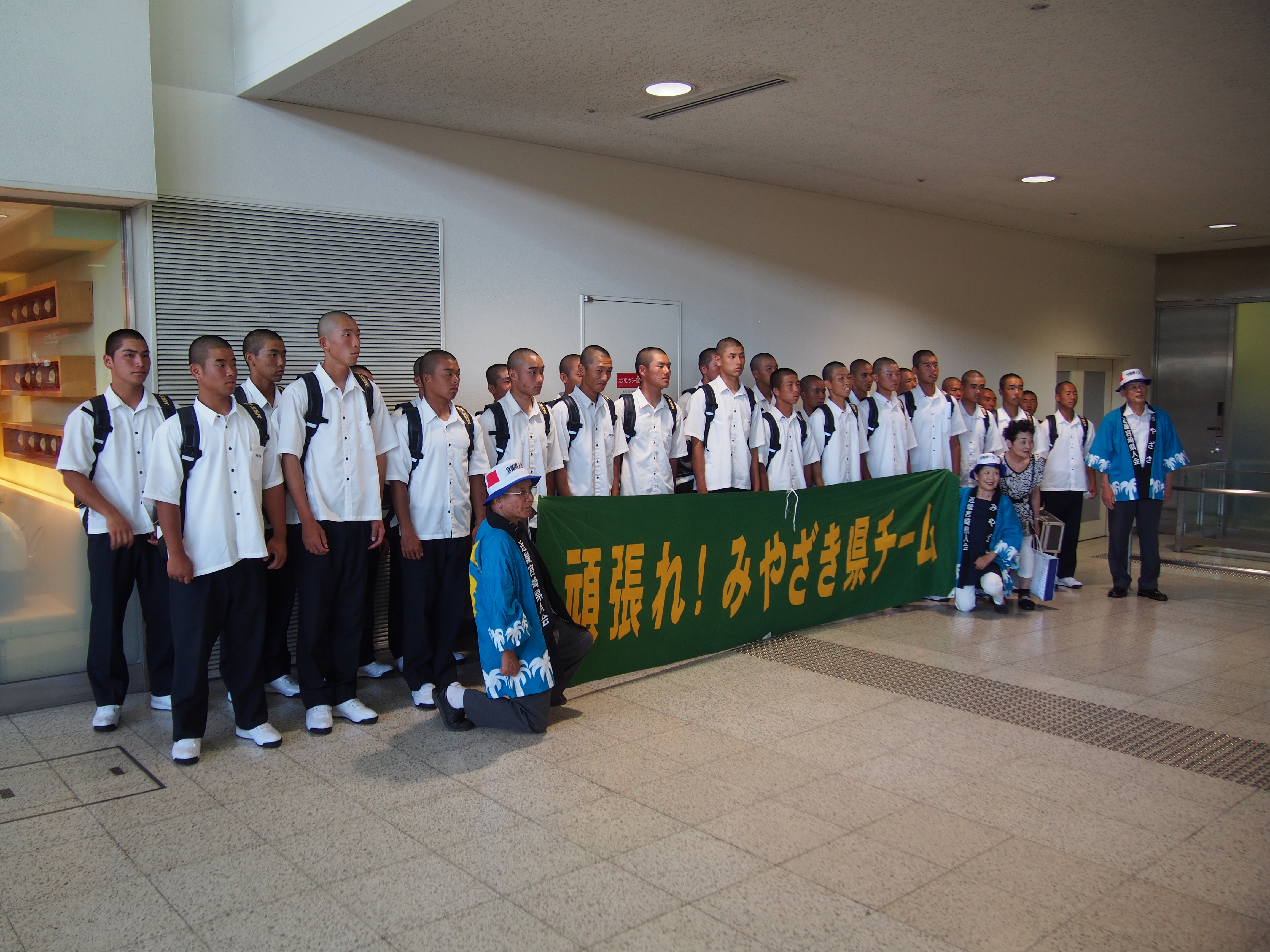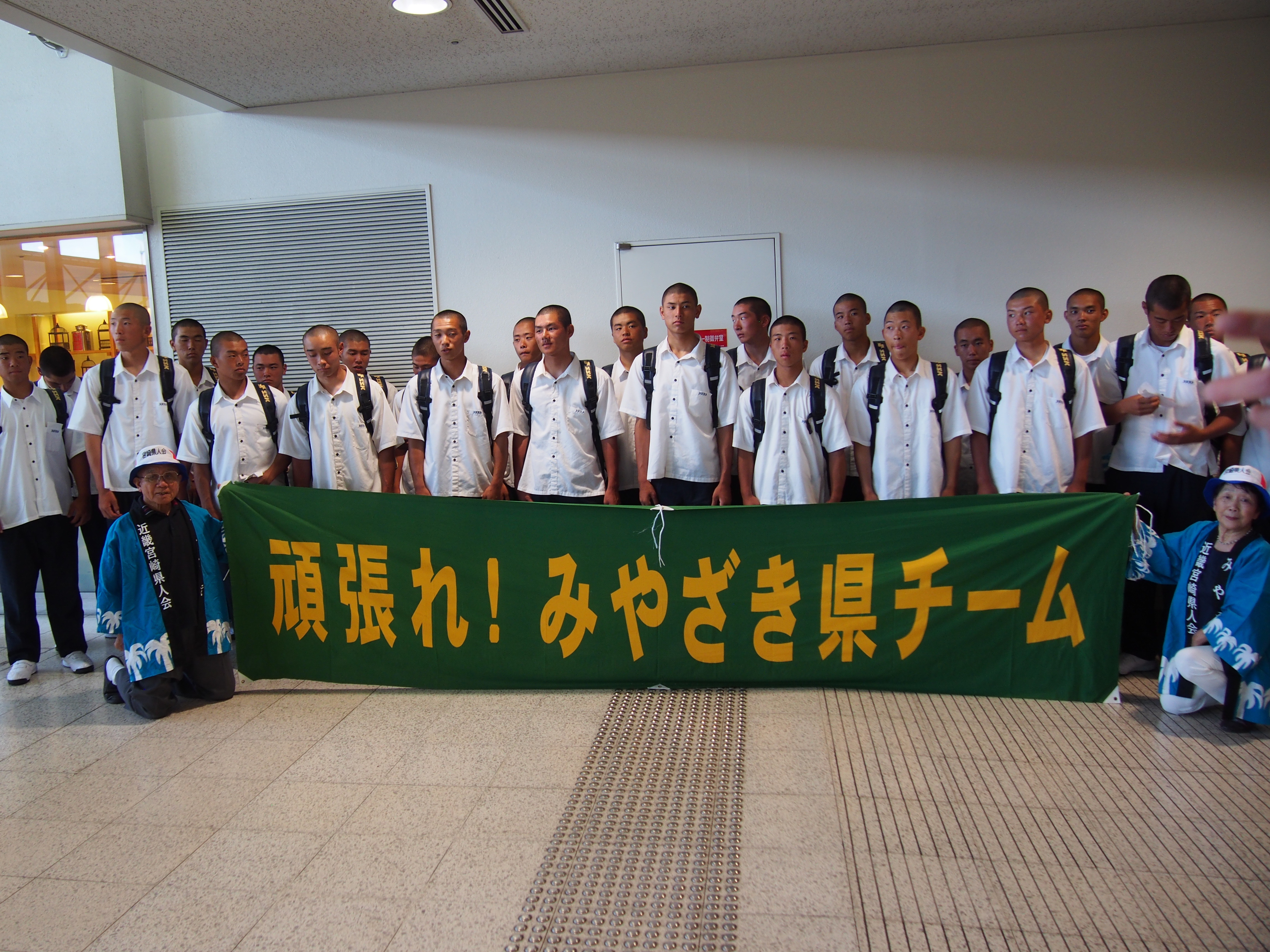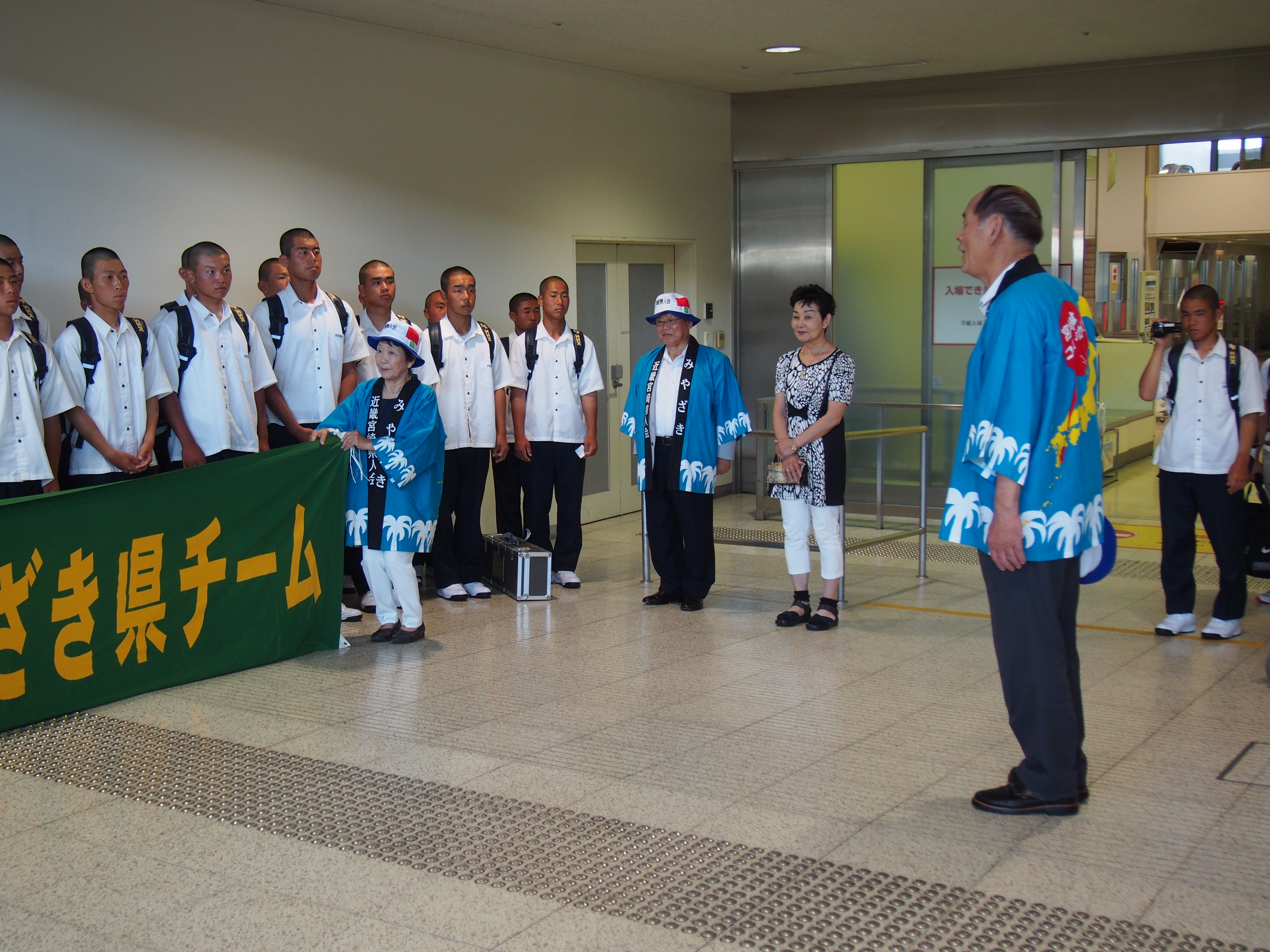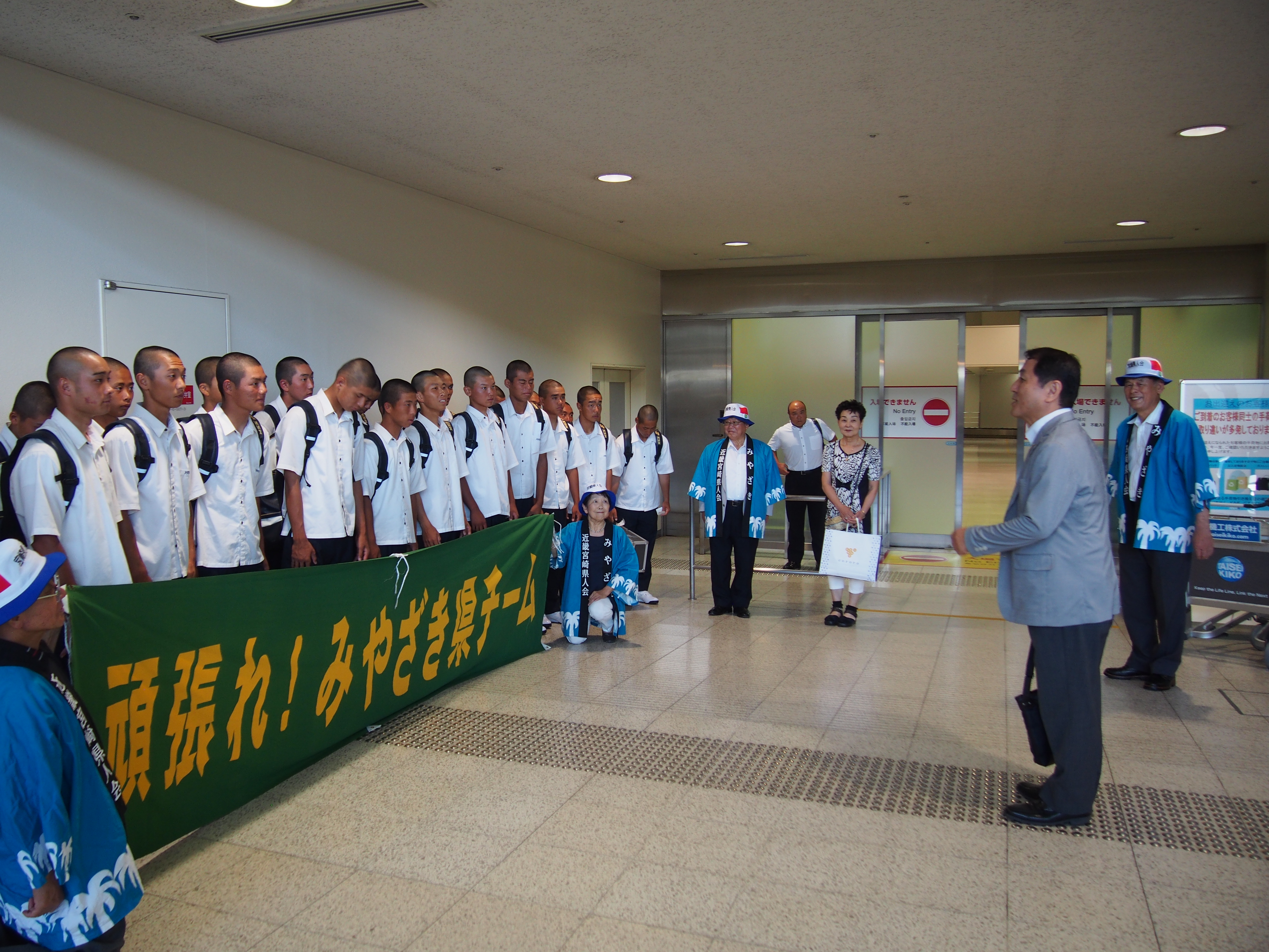 第99回全国高校野球選手権大会に宮崎県代表として、12年ぶり2度目の甲子園出場を決めて、甲子園での練習、試合抽選会、開会式等参加の為、平成29年8月3日(木)にANAで伊丹空港12:30着で元気に来られました。到着出口ロビーで宮崎県大阪事務所、近畿宮崎県人会、関西延岡会、ホテルNCB等の皆様で出迎え激励を致しました。