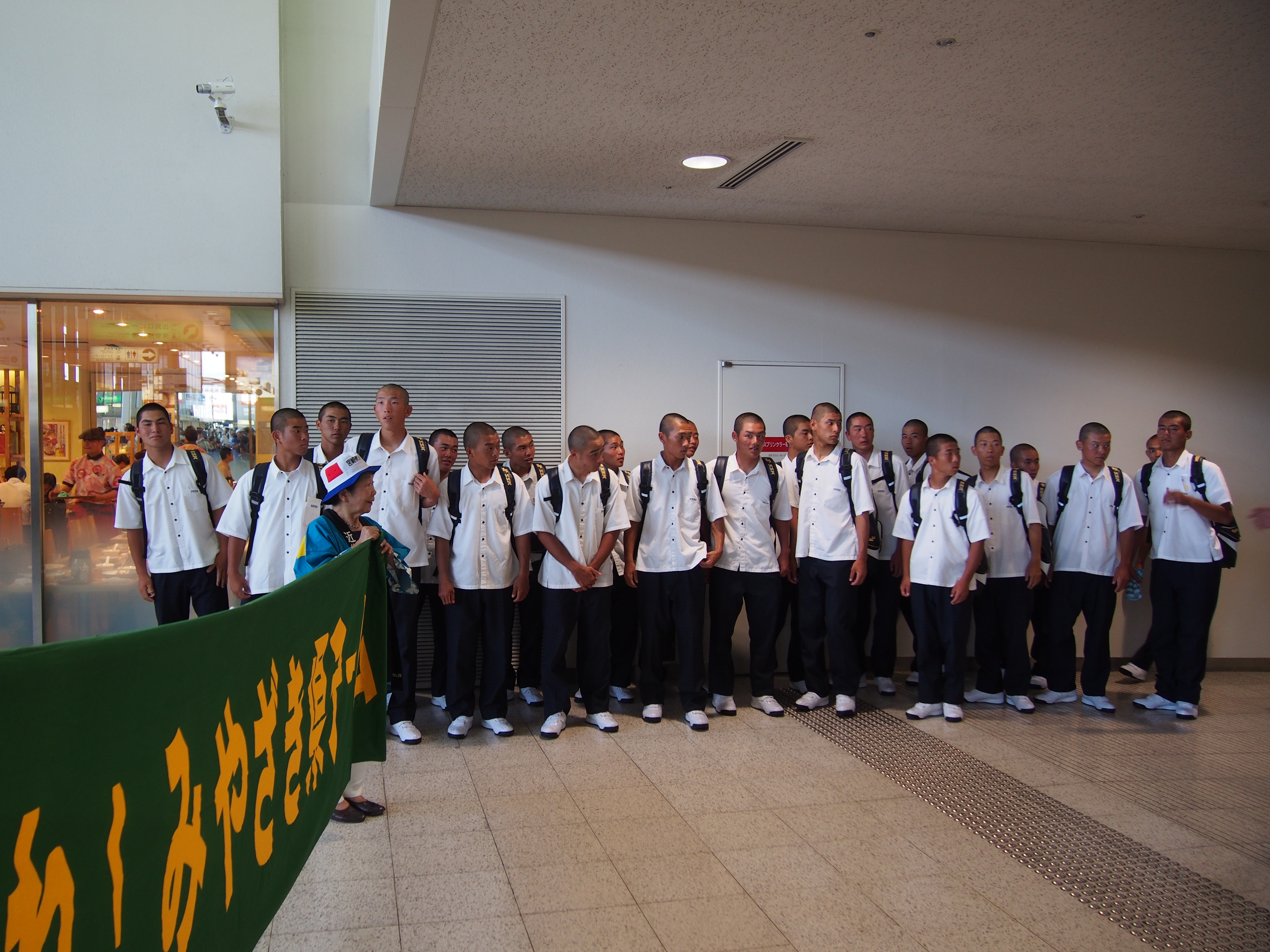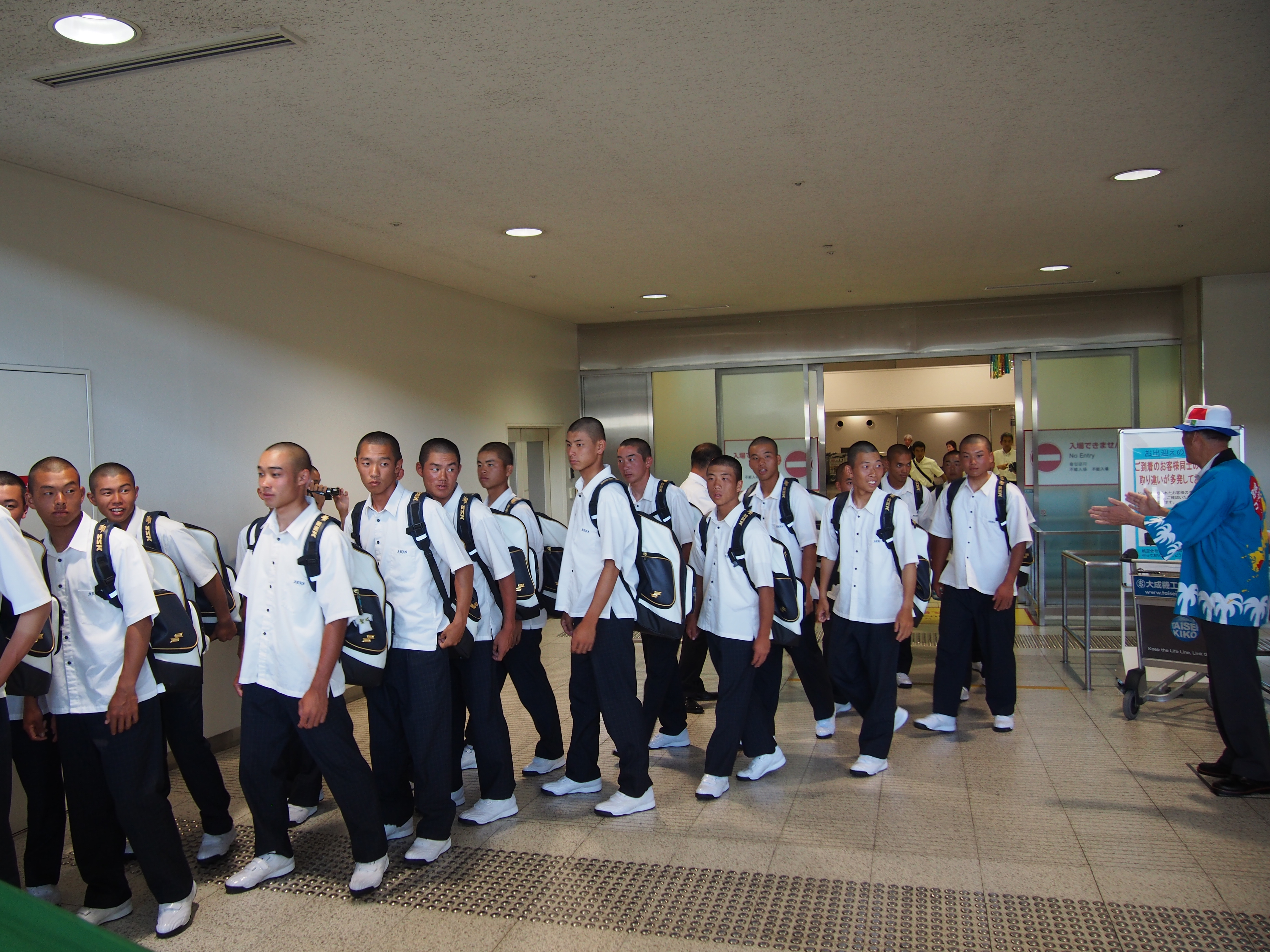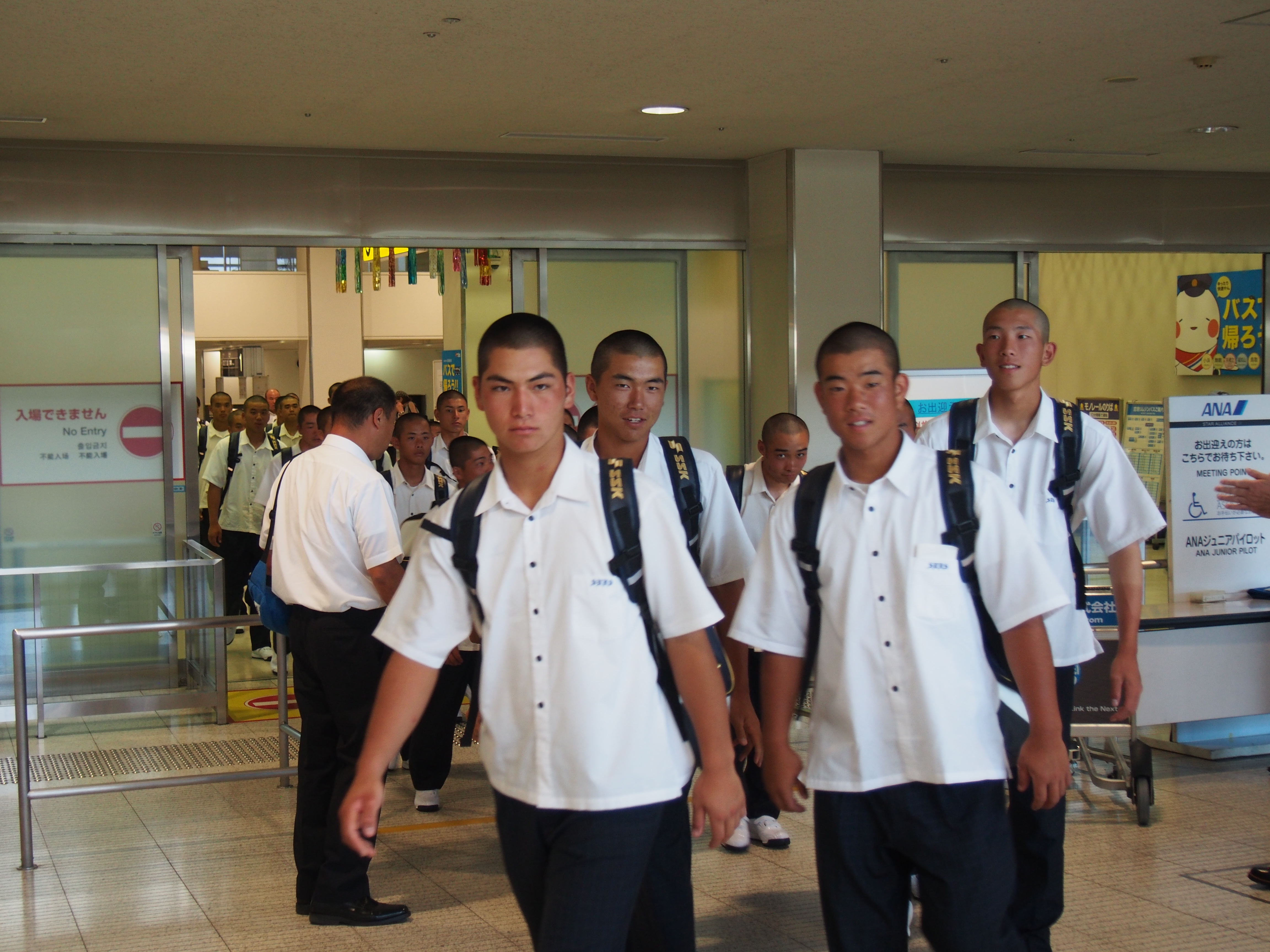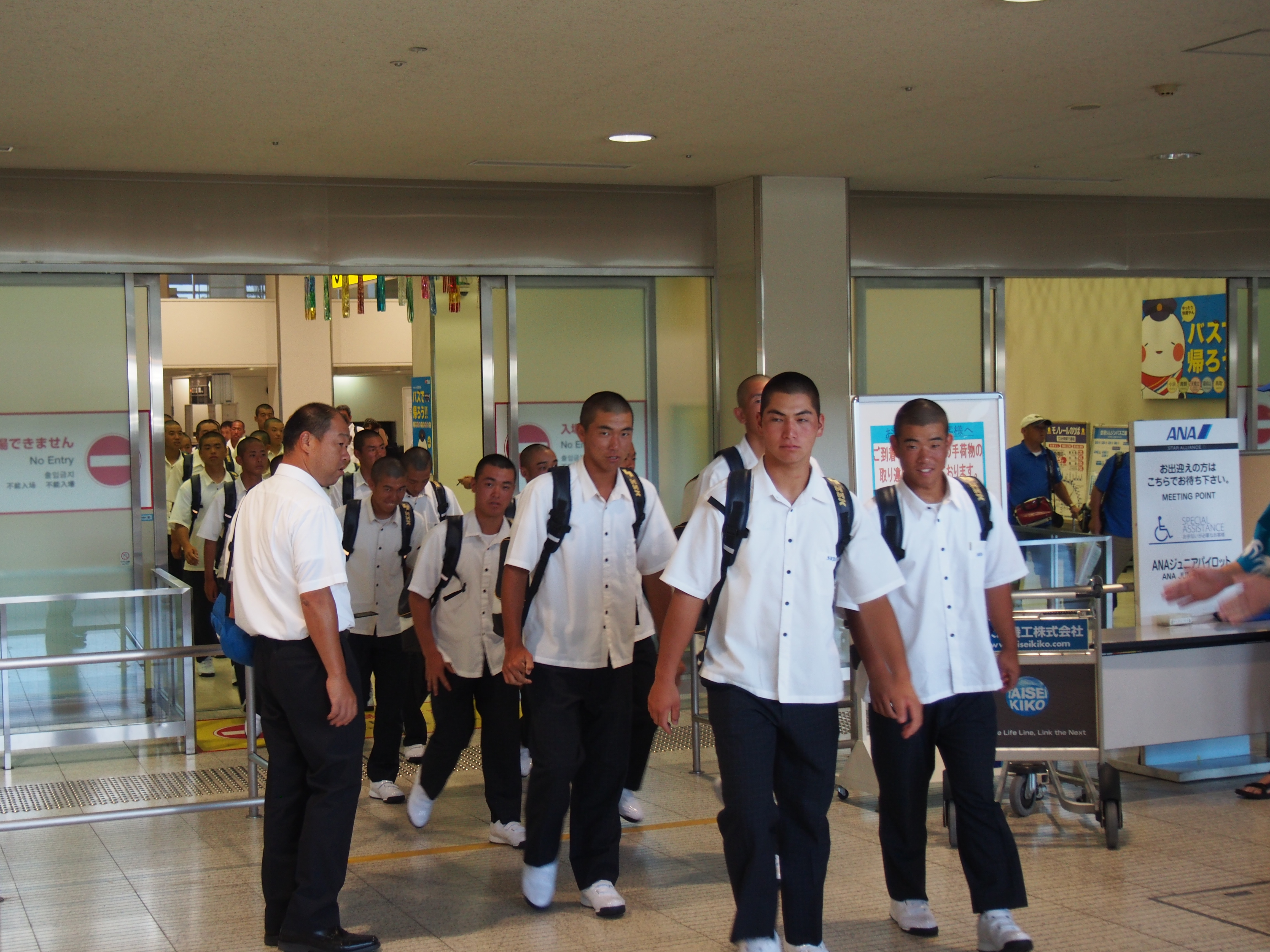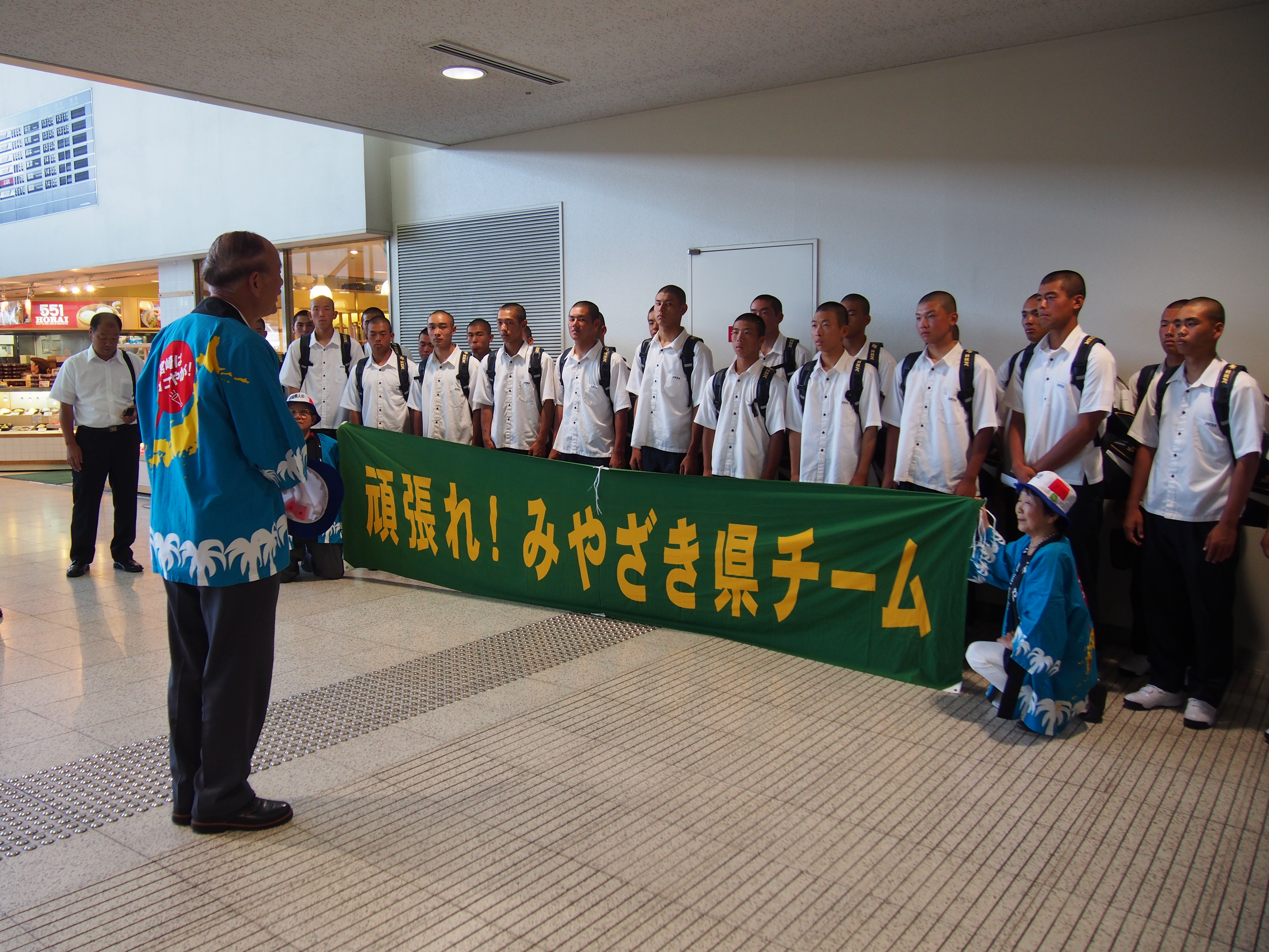 第99回全国高校野球選手権大会に宮崎県代表として、12年ぶり2度目の甲子園出場を決めて、甲子園での練習、試合抽選会、開会式等参加の為、平成29年8月3日(木)にANAで伊丹空港12:30着で元気に来られました。到着出口ロビーで宮崎県大阪事務所、近畿宮崎県人会、関西延岡会、ホテルNCB等の皆様で出迎え激励を致しました。