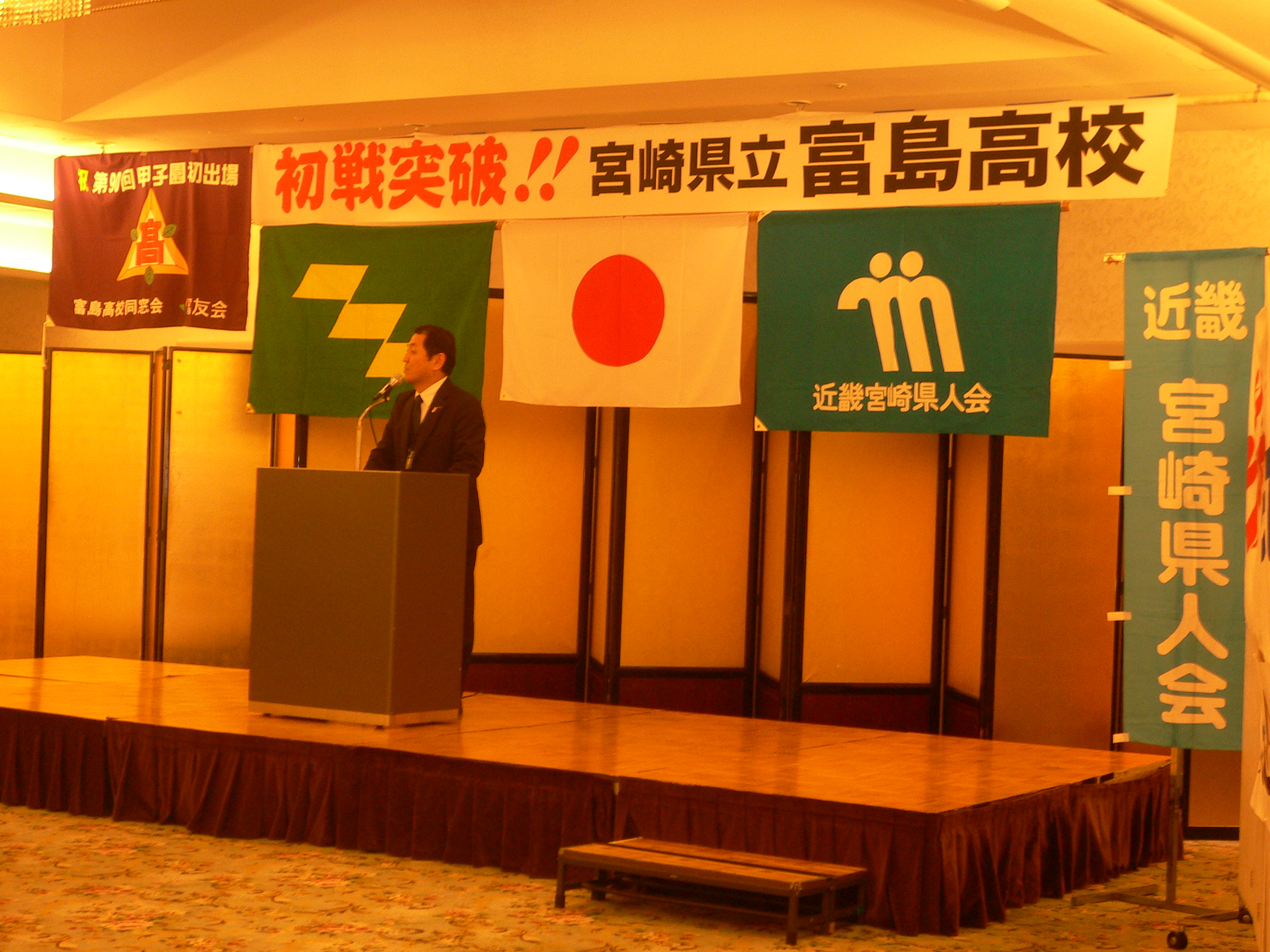 第1部の激励会では、選手全員入場後、近畿宮崎県人会会長・貫安利様の開会挨拶の後、宮崎県大阪事務所所長・神菊憲一様、富島高校同窓会本部会長・三輪正明様、富島高校関西同窓会会長・伊賀絹代様から激励挨拶を頂きました。出場お祝いを各団体より贈呈後、富島高校・校長・馬場隆様から謝辞が有りました。引き続いて選手紹介を濱田登監督の指示により各自から決意自己紹介が有りました。最後に甲子園での初戦突破を祈念して近畿宮崎県人会スポーツ部会長・郡司長史様より激励エールして選手の皆様を拍手にて退室送り出しました。