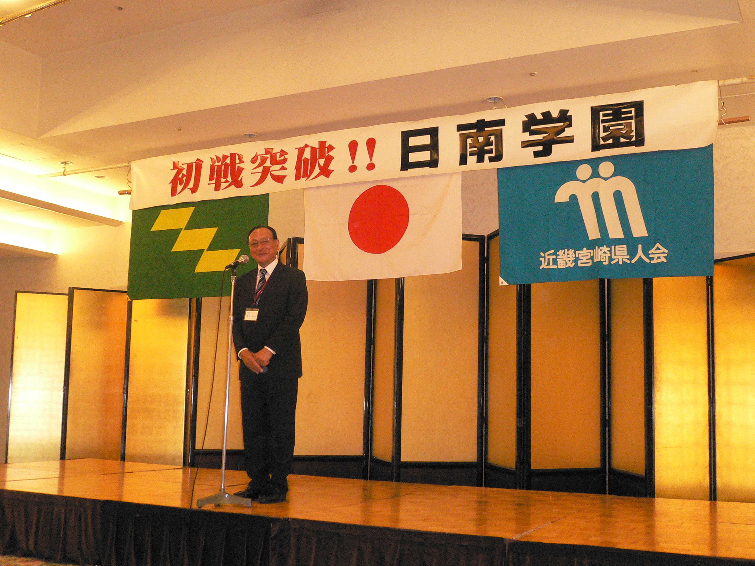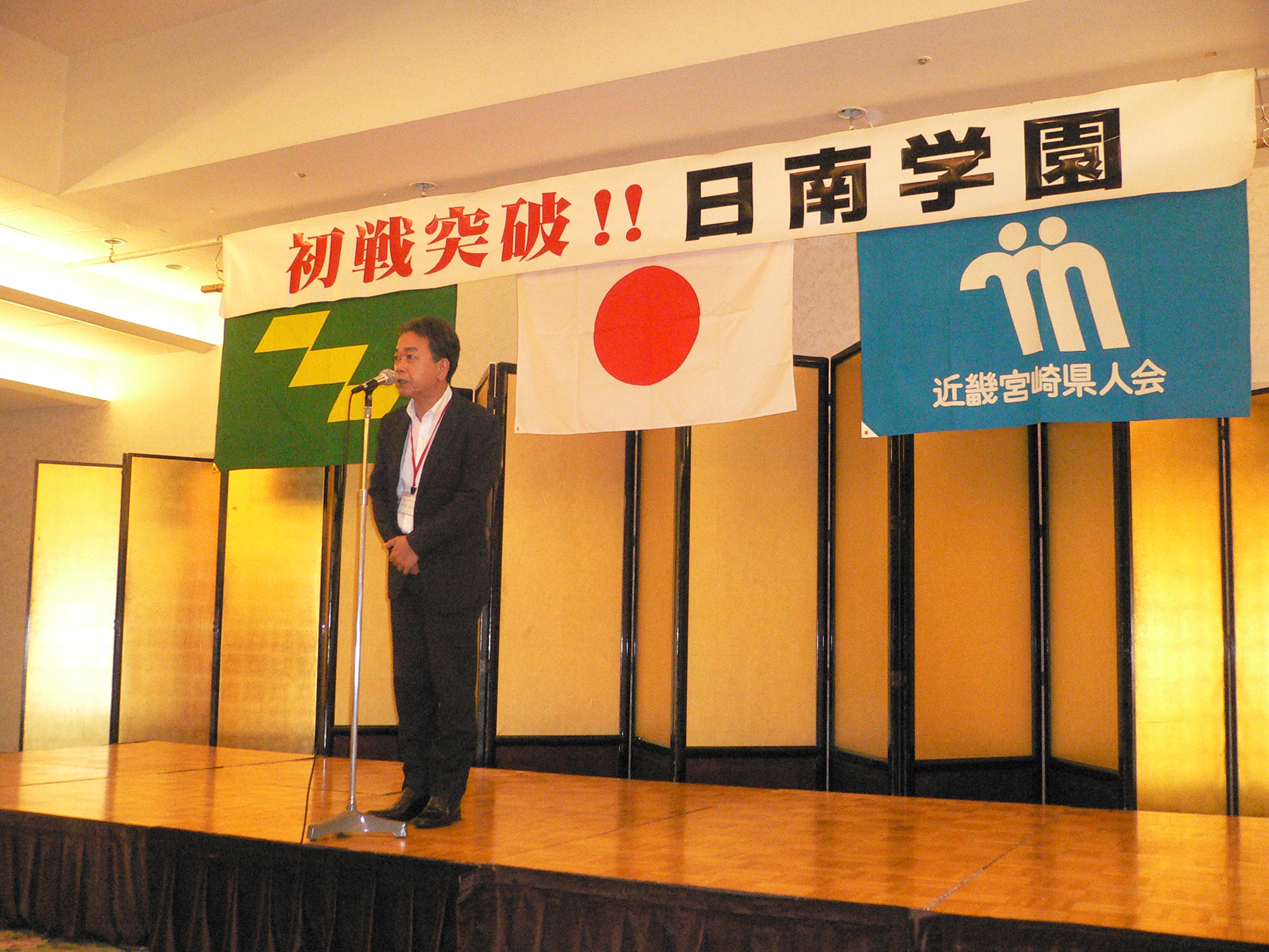 第1部の激励会では、選手全員入場後、近畿宮崎県人会会長・貫 安利様の開会挨拶の後、宮崎県大阪事務所所長・神菊 憲一様、近畿日南会会長・福田 満男様、近畿串間会会長・川崎 俊郎様から激励挨拶を頂きました。出場お祝いを各団体より贈呈後、日南学園・理事長・添田昌邦から謝辞が有りました。引き続いて選手紹介を金川豪一郎監督の指示により各自から決意自己紹介が有りました。最後に甲子園での初戦突破を祈念して集合写真後激励の拍手を持って送り出しました。
