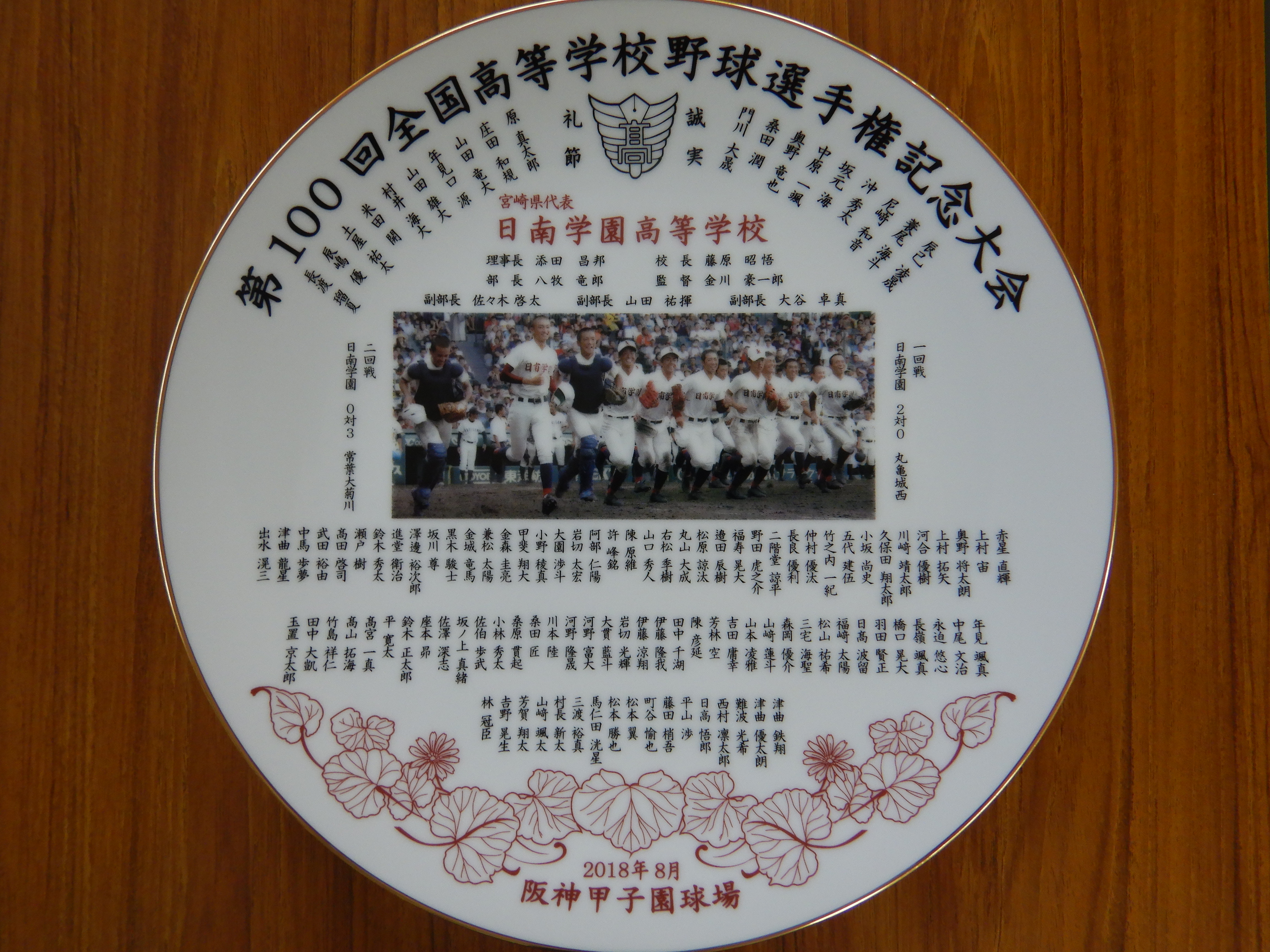 第100回全国高校野球選手権大会において、日南学園高校が2年ぶり9度目の甲子園出場をし、それを祝して記念プレートを作成し、宮崎穎学館館長・黒木康一様と事務局渉外主任・斉藤みさ様が持参(H30.11.6)して頂き、宮崎県大阪事務所内の入口陳列棚に置きました。