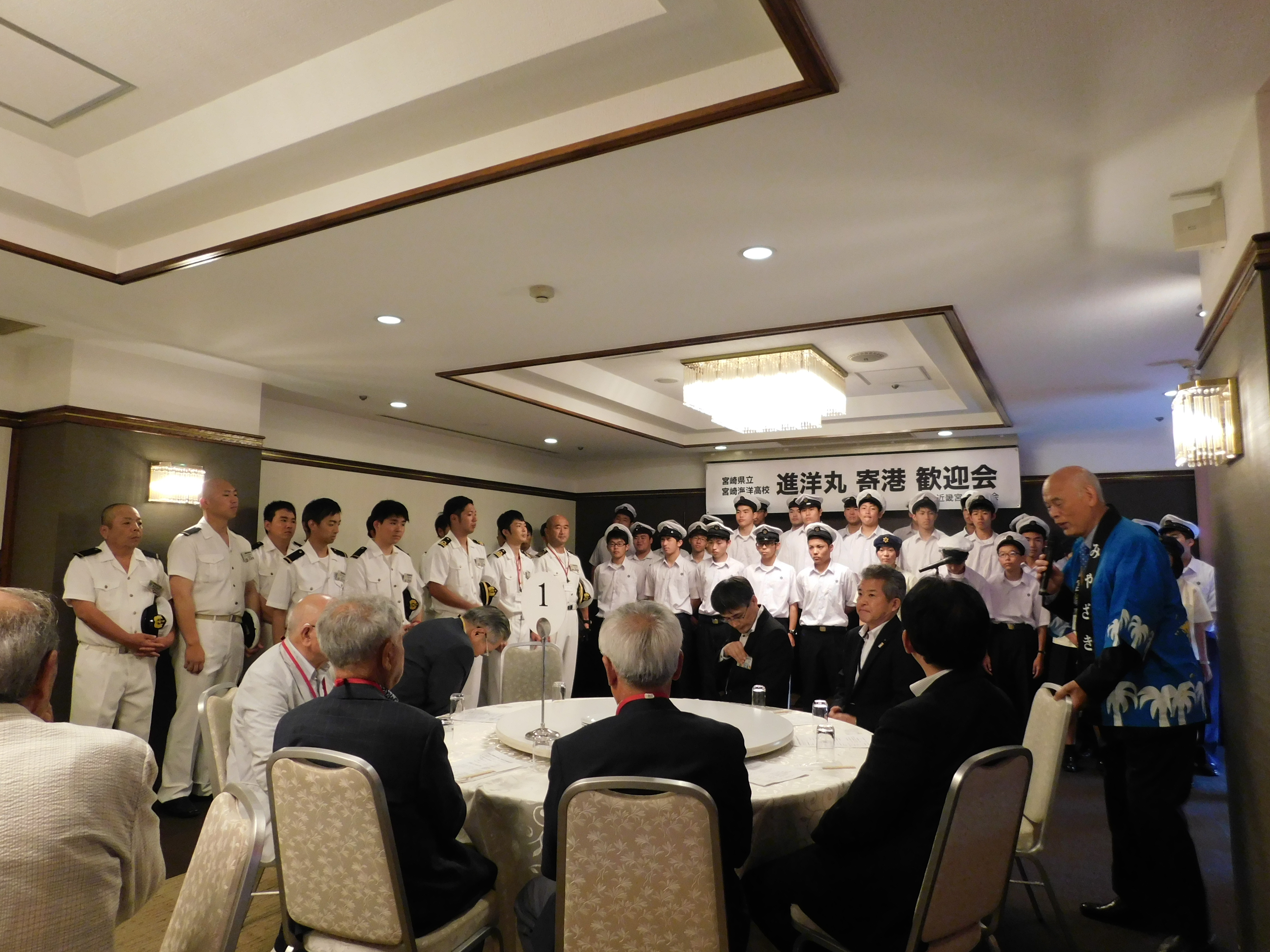 第1部の歓迎会では、近畿宮崎県人会会長・貫安利様の開会挨拶後、宮崎県大阪事務所所長・岩本真一様と関西若潮同窓会会長・渡邉千尋様の歓迎挨拶を頂き、実習生の皆様に、関西若潮同窓会より尾道・お菓子、近畿宮崎県人会より大阪名物551の豚まんと千鳥屋饅頭に昨年の進洋丸寄港時掲載会報、古田ゆき子様の手作り小物入れと味噌を贈呈する。実習生生徒代表から歓迎式お礼有り、宮崎海洋高校校長・鍋倉一幸様から謝辞等、小野清船長から行程等とお礼等を頂きました。最後に生徒の皆様より実習時のマグロ缶詰を参加者全員に頂きました。