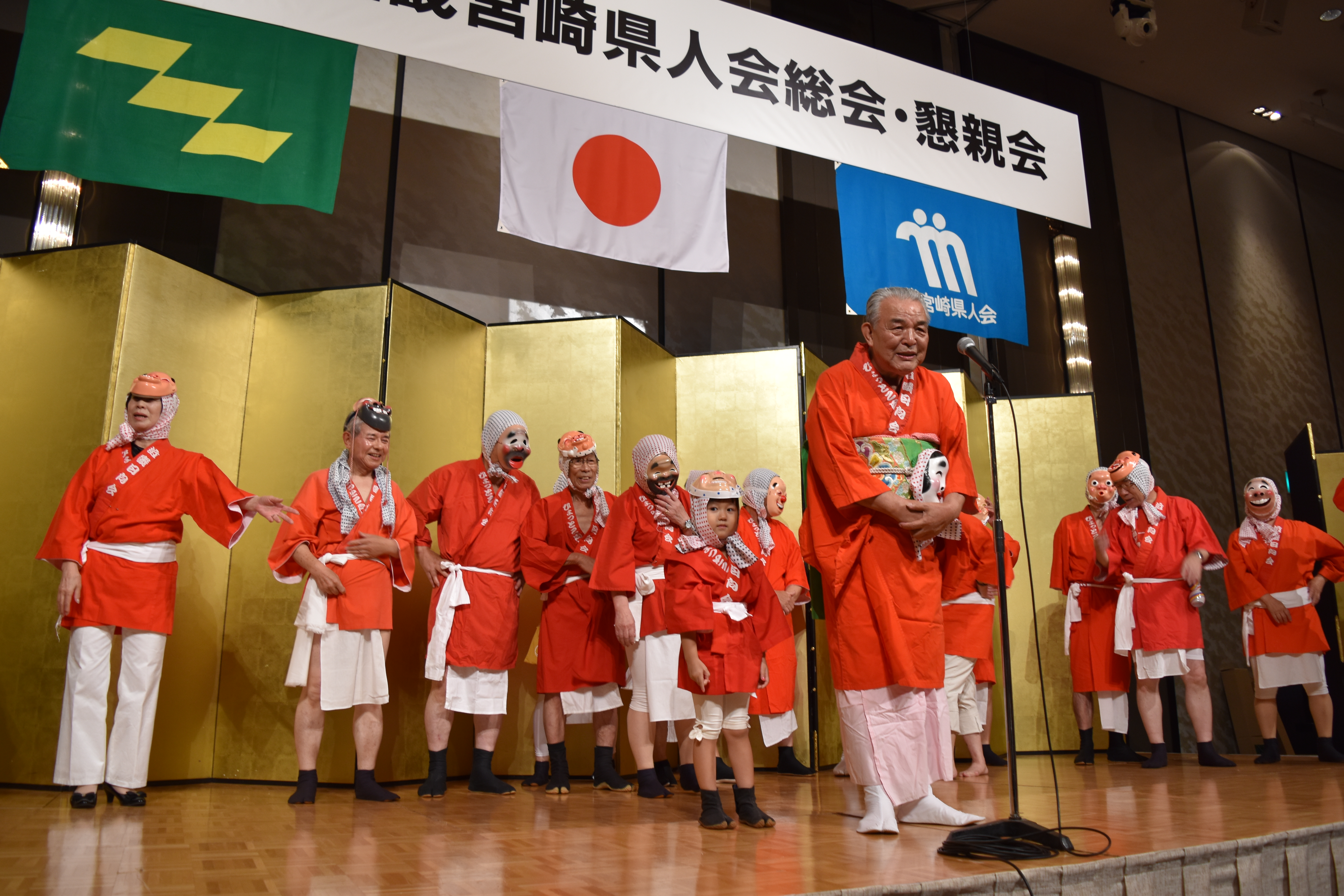 4,懇親会は、宮崎市長・戸敷正様のご挨拶と乾杯の音頭で始まり、ホテルの料理に舌鼓を打ちながら、会長の言葉にあった「今日は宮崎のお国ことばではなそう」と言う事から、打ち解けた歓談となりました。アトラクションではおなじみの日向ひょっとこ踊り(近畿日向会)、去年に引き続き大正琴による「百万本のバラ」など演奏(近畿西都会有志)等で皆さんが壇上に上がり、日ごろ練習の芸を披露していただき、市町村会・同窓会の応援もあって盛り上がりました。