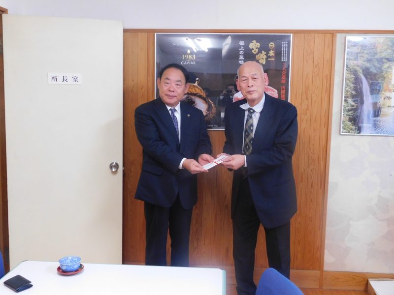 宮崎日大高校より副校長・間野寛樹様と事務局・田野矩大様、小林高校より校長・戸高慶三様が来所され、宮崎県大阪事務所と近畿宮崎県人会にて応対を致し、両校に出場のお祝い金を渡しました。又、大会当日(R01.12.22)の健闘を祈念致しました。